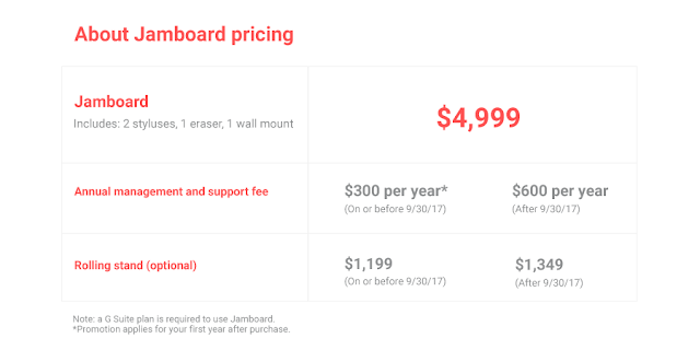 Jamboard の販売価格は 4,999 米ドルで、スタイラス 2 本、イレイサー 1 個、壁掛け用マウント 1 個が付属しています。また、プロモーションも実施中で、2017 年 9 月 30 日までにご注文いただくと、年間管理およびサポート料が 300 米ドルの割引になり、オプションのキャスター付きスタンドも割引料金でご提供いたします。